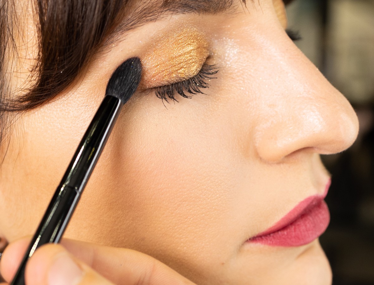 Carlotta Rubaltelli: smokey eyes dorato e labbra rosso rubino scuro